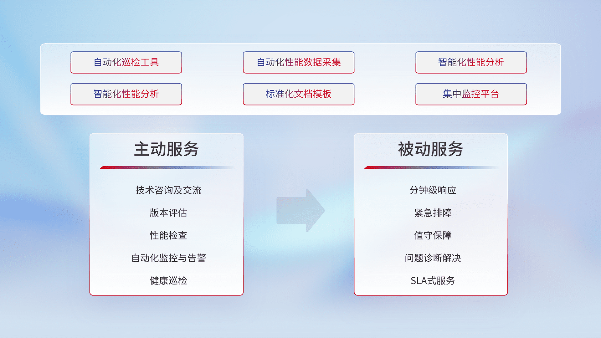 智能化工具和标准化文档,,,保障服务质量,,提供主动服务(包含技术咨询、、、版本评估、、性能检查、、、自动化监控与告警、、健康巡检)和被动服务包含(分钟级响应、、、、紧急排障、、、、值守保障、、问题诊断解决、、、、SLA服务)。。。。